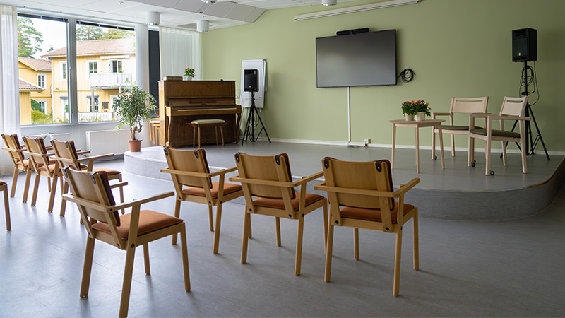 Vi erbjuder flera olika aktiviteter och vårt mål är att ha ett så stort utbud som möjligt. Exempel på aktiviteter är gymnastik, musikunderhållning, fester och gemensamma aktiviteter med skolbarn. Vi har en stor samlingssal som vi använder vid olika aktiviteter och högtider. Samlingssalen går också att boka av er som bor här, om ni till exempel vill ha fest med era anhöriga.