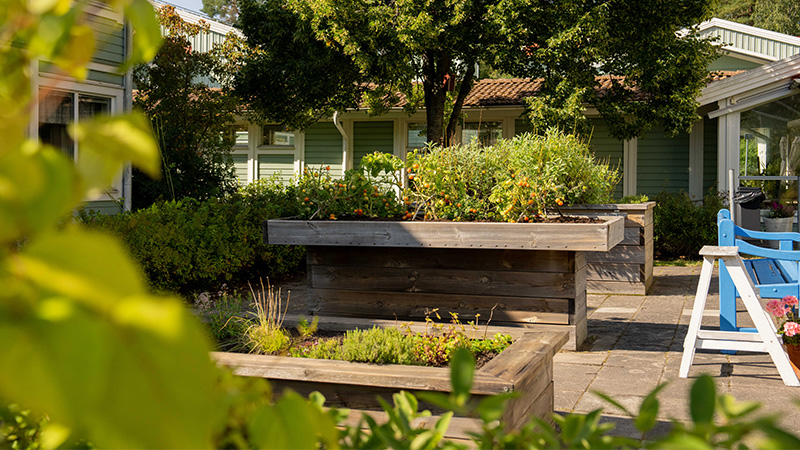 I vår fina trädgård kan du som bor här umgås och delta i olika aktiviteter tillsammans med andra. Här kan du till exempel spela spel eller kanske bara njuta av en kopp kaffe i solen.