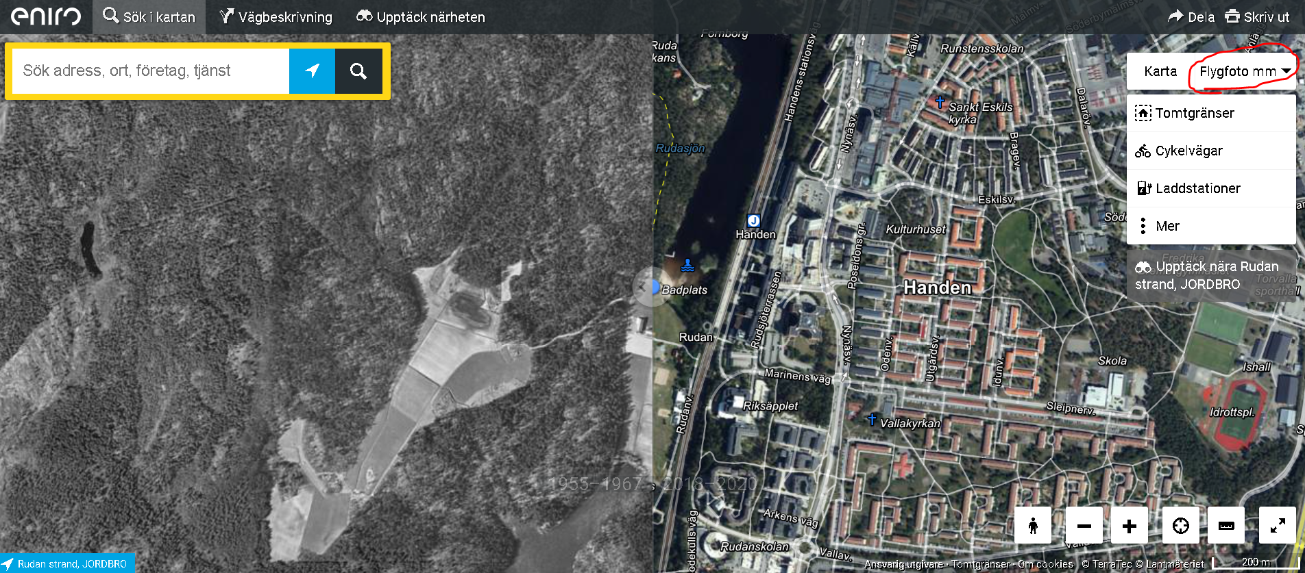 Eniro har en karttjänst med flygfoton tagna vid mitten av 1900-talet. Med ett reglage kan du jämföra nytagna flygbilder med gamla, på ett enkelt sätt. Här kan man hitta mycket spännande saker: Har jordbruksmark försvunnit? Har bebyggelse tillkommit? Finns det hus eller gårdar som har rivits? Hur såg det ut då vid vår skolgård? Finns mitt hus, om inte hur såg det ut då? Öppna karttjänsten Eniro här, välj "Flygfoto m m" och sedan "Historiska flygfoton".
